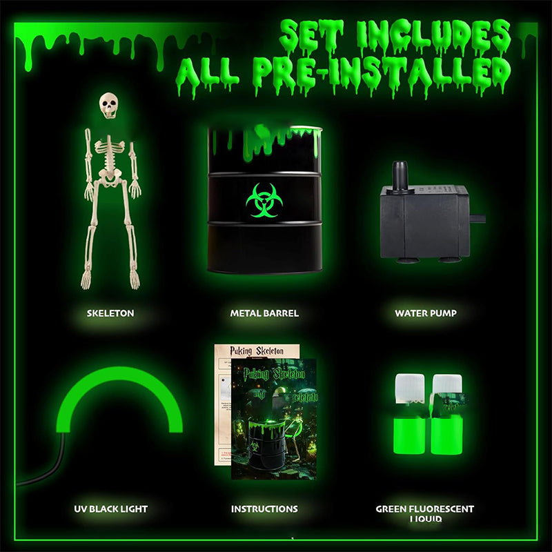 ETT FLOTTANDE WIZARD DOKTORSET ATT GÖRA EGET AV - FÖRÄNDRAR ALLA RUM: Detta dekorativa set ger rummet en mystisk atmosfär med en svart metallkittel, en detaljerad skelettfigur och trolldrycksflaskor fyllda med fluorescerande vätska som lyser under UV-ljus. Den medföljande vattenpumpen cirkulerar vätskan för att skapa en flödande, glödande effekt - perfekt för Halloween eller andra kusliga teman på bordet, spiselkransen, verandan eller i trädgården.
