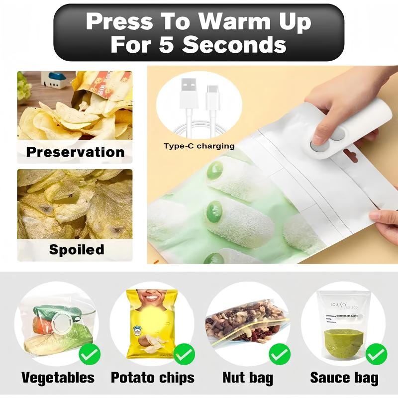 BRED KOMPATIBILITET: Förseglar effektivt en mängd olika påsar, inklusive vanliga snackspåsar, foliepåsar och foderpåsar för husdjur. Denna mångsidighet hjälper dig att bibehålla färskheten hos olika varor i ditt skafferi.