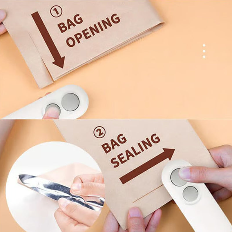 DUBBELFUNKTIONSDESIGN: Den här enheten integrerar praktiskt både en förslutare och en skärare. Det dolda bladet gör att du enkelt kan öppna påsar samtidigt som säkerheten garanteras, vilket gör det till det enda verktyget du behöver för påshantering.
