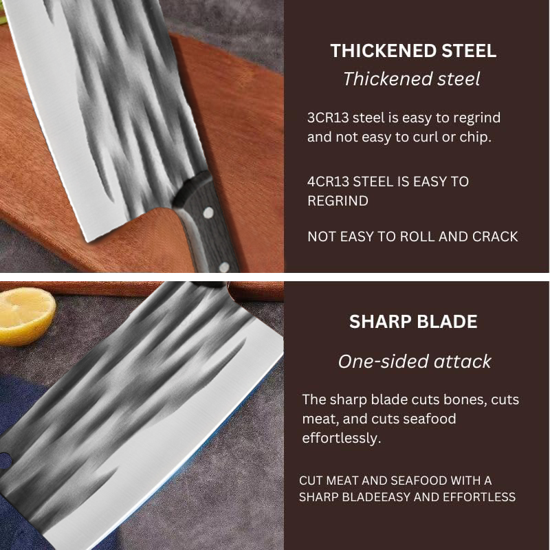 Mångsidig kniv för enkel skärning, skivning och hackning – Oavsett om du skär kött, grönsaker, frukt eller örter levererar denna kniv utmärkt precision och kontroll. Designad för hemmakockar, professionella kockar och matentusiaster, är den ett oumbärligt verktyg för enkel matberedning i hemmakök, restauranger, grillfester och utomhusmatlagning.