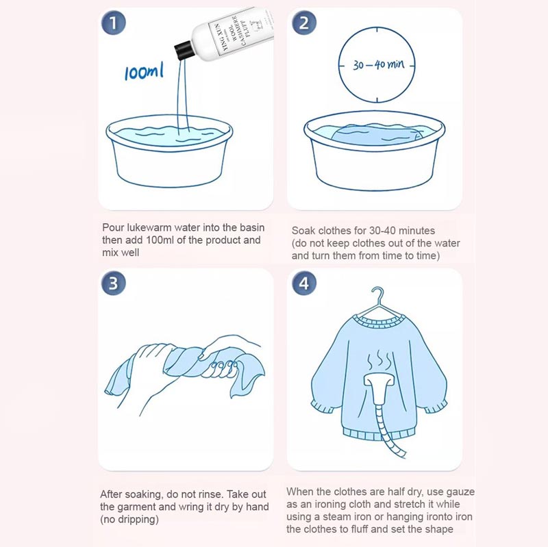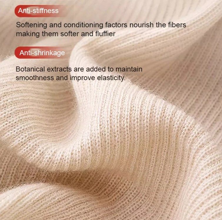 ÅTERSTÄLLNING AV KRYMPTA PLAGG: Detta medel slappnar effektivt av och sträcker fibrerna i krympta ylletröjor, vilket gör att du kan återfå den ursprungliga storleken och passformen på dina plagg.