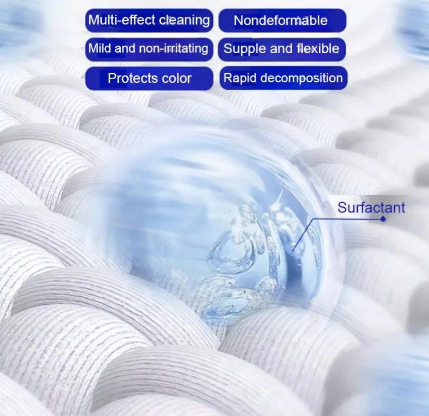 Huvudingredienser: Ytaktiva ämnen, enzymer, mjukgörare, fluffande medel, avjoniserat vatten, och så vidare.